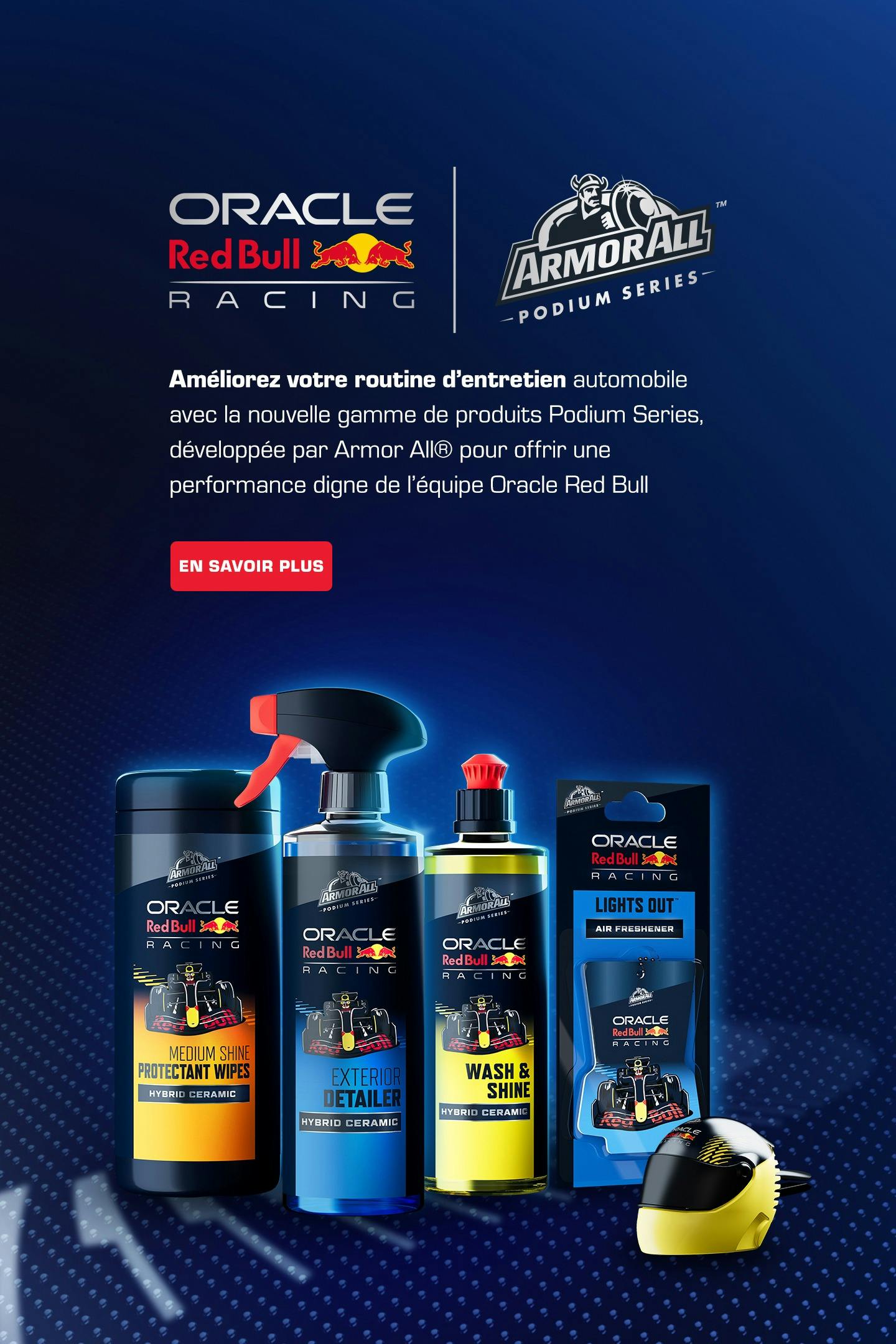 Armor All® bénéficie de la confiance de l’équipe six fois championne du monde de F1, Oracle Red Bull Racing. Cliquez ici pour en savoir plus sur ce partenariat passionnant et pourquoi Armor All® est Le Choix des Champions™.